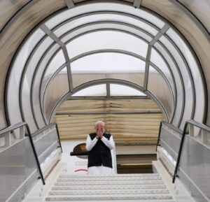 विमान की सीढ़ियों से हाथ जोड़कर नमस्ते करना मोदी की कूटनीति और भारतीय परंपरा दोनों का परिचायक है। यह तस्वीर भारत की “सॉफ्ट डिप्लोमेसी” को दर्शाती है, जहाँ संस्कृति और राजनीति साथ-साथ चलती हैं।