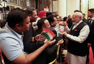 चीन में बसे प्रवासी भारतीयों ने प्रधानमंत्री मोदी का जोशीले नारों और तिरंगे झंडों के साथ स्वागत किया। मोदी ने भी उनसे हाथ मिलाया और बातचीत की। यह दृश्य विदेशों में बसे भारतीयों की आस्था और जुड़ाव को दर्शाता है।