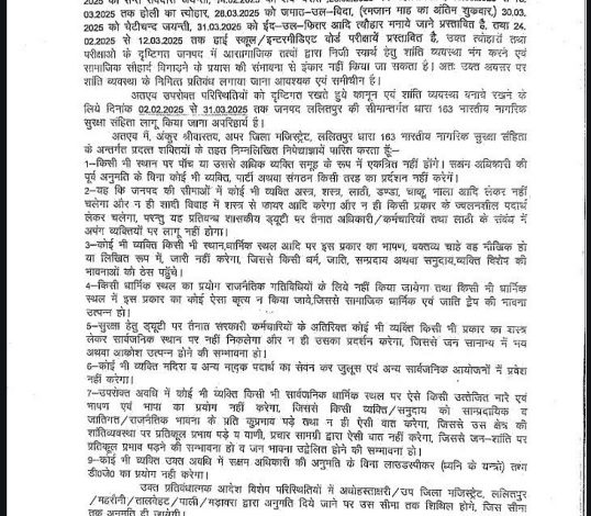 बताते चले कि फरवरी 2025 में दिनाँक 02.02.2025 को वसंत पंचमी, 12.02. 2025 को सन्त रविदास जयन्ती, 14.02.2025 को शये-वरात 28.02.2025 को महाशिवरात्रि, 13.03.2025 से 15. 03.2025 तक होली का त्योहार, 28.03.2025 को जमात-उल-विदा, (रमजान माह का अंतिम शुक्रवार) 30.03. 2025 को चेटीचन्द जयन्ती, 31.03.2025 को ईद-उल-फित्तर आदि त्यौहार मनाये जाने प्रस्तावित है, तथा 24. 02.2025 से 12.03.2025 तक हाई स्कूल/इन्टरमीडिएट वोर्ड परीक्षायें प्रस्तावित है, उक्त त्योहारों तथा परीक्षाओं के दृष्टिगत जनपद में आसामाजिक तत्वों द्वारा निजी स्वार्थ हेतु शांति व्यवस्था भंग करने एवं सामाजिक सौहार्द बिगाड़ने के प्रयास की संभावना से इंकार नहीं किया जा सकता है। अतः उक्त अवसर पर शांति व्यवस्था के निमित्त प्रतिबंध लगाया जाना आवश्यक एवं समीचीन है।