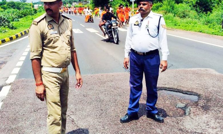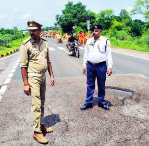 पवित्र माह श्रावण मास के तृतीय सोमवार को शहर में श्री तुवन मंदिर प्रांगण से कांवड़ यात्रा का शुभारंभ किया गया। यह कांवड़ यात्रा शहर मुख्यालय से शुरू होकर पाली नीलकण्ठेश्वर धाम तक निकाली गयी। इस दौरान यात्रा को सुव्यवस्थित तरीके से निकाले जाने को लेकर पुलिस सुरक्षा व्यवस्था मुस्तैद रही। वहीं दूसरी ओर पुलिस अधीक्षक मो.मुश्ताक के आदेश, एएसपी अनिल कुमार व क्षेत्राधिकारी सदर अभय नारायण राय के निकट पर्यवेक्षण में यातायात व्यवस्था भी दुरुस्त रखी गयी। यात्रा के दौरान यातायात व्यवस्था को यातायात प्रभारी आलोक कुमार तिवारी अपने हमराहियों के साथ संभाले रहे। यातायात पुलिस मुख्यालय से लेकर कस्बा पाली तक यात्रा के आगे-आगे चलकर यात्रियों को सुरक्षित मार्ग व्यवस्था बनाये रखीं। गौरतलब है कि सोमवार का श्रावण मास में विशेष महत्व होता है। इस दिवस मुख्यालय से विशाल कांवड़ यात्रा निकाली गयी। यह यात्रा पाली स्थित नीलकण्ठेश्वर धाम तक निकाली गयी। यात्रा को सुव्यवस्थित तरीके से निकालने के लिए यातायात पुलिस का महत्वपूर्ण योगदान रहा। यातायात प्रभारी आलोक कुमार तिवारी स्वयं यात्रा के आगे-आगे पैदल चलकर कांवडिय़ों को सुरक्षित मार्ग मुहैया कराते रहे। वहीं दूसरी ओर कई स्थानों पर रूट डायवर्जन करते हुये यात्रा मार्ग को सुगम बनाया गया। इस दौरान आमजन के साथ-साथ बुजुर्गों, दिव्यांगों और मरीजों की एम्ब्युलेंस के लिए पृथक से व्यवस्था बनाते हुये यातायात व्यवस्था को सुगम बनाये रखा गया।