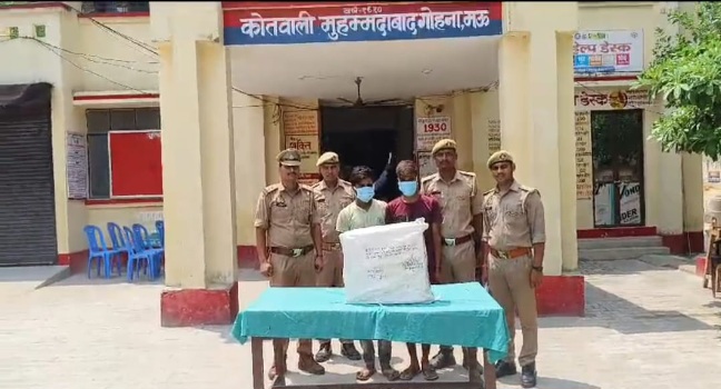मोहम्मदाबाद गोहना कोतवाली क्षेत्र पुलिस अधीक्षक इलमारन जी के कुशल नेतृत्व व श्रीमान अपरपुलिस अधीक्षक महोदय के पर्वेक्षण में व क्षेत्राधिकारी महोदय मु0बाद गोहना जनपद मऊ के कुशल निर्देशन में संदिग्ध / वांछित अपराधियों की गिरफ्तारी हेतु चलाये जा रहे अभियान के दौरान मु0बाद पुलिस को गिरफ्तारी में बड़ी सफलता प्राप्त हुई है जिसमें चोरी के सामान सहित अभियुक्त को पुलिस ने गिरफ्तार किया । अभियान के क्रम में आज दिनांक 28/06/2024 को उ0नि0 फूलचन्द्र यादव व उ0नि0 अमितेश मिश्रा अपने हमराहियो के साथ चेकिंग के दौरान मुखबिर खास की सूचना जो तुलसीपुर कुढवा में कुछ दिन पहले जो डीजे मशीन चोरी हूई थी, उसी को बेचने के लिए दो लोग करहां से आजमगढ़ जा रहे हैं इस सूचना पर पुलिस टीम करहां जाने वाले मार्ग पर पडने वाले भैंसहां मोड़ पर सड़क को दोनो तरफ से इंतजार करने लगे कि दो व्यक्ति पैदल आते हुए दिखायी दिये,जो एक डीजे मशीन को दोनो तरफ से पकड़े हुए थे दोनो व्यक्तियो के और पास आने पर पुलिस टीम वालो द्वारा उनको रूकने का इशारा किया गया तो एकाएक हम पुलिस वालो को देखकर दोनो व्यक्ति उक्त डीजे मशीन लेकर सकपका कर पीछे मुड़कर भागना चाहे की पुलिस टीम द्वारा मौके पर ही डीजे मशीन के साथ पकड़ लिया गया । पकड़े गये दोनो व्यक्तियो से नाम पता पूछता गया तो उन्होने अपना नाम 1. गौरव कुमार पुत्र घूरा राम निवासी ठकुरीपट्टी थाना मु0बाद गोहना जनपद मऊ 2. राहुल कुमार पुत्र परमेश प्रसाद निवासी ठकुरीपट्टी थाना मु0बाद गोहना जनपद मऊ बताया। मौके पर दोनो व्यक्तियों को पूर्व में पंजीकृत मु.अ.सं. 207/2024 धारा 379 भादवि का बोध कराते हुए उक्त डीजे मशीन को सीज किया गया तथा धारा बढोत्तरी करते हुए गिरफ्तार कर नियमानुसार कार्यवाही कर आज दिनांक को मा0 न्यायालय रवाना किया गया ।