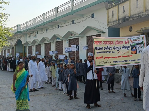 मुहम्मदाबाद गोहना तहसील क्षेत्र लोकसभा चुनाव के मद्देनजर शुक्रवार को मदरसा अरबिया फैज ओलूम मुहम्मदाबाद गोहना के शिक्षकों व छात्रों ने नगर के कई मोहल्लों में मतदाता जागरूकता अभियान निकाला और मतदाता जागरूकता संबंधी नारे लगाए। और लोगों को यह पैगाम दिया कि हमारा मत बहुत कीमती है। हर हाल में आइंदा आने वाले 1 जून 2024 को अपने सारे कामों को छोड़कर सबसे पहले वोट देने का काम करें और निर्भीक होकर मतदान करें। इस मौके पर स्कूल के प्रिंसिपल मौलाना मुहम्मद आरिफ, मौलाना मुहम्मद काशिफ रजा, मौलाना मुहम्मद इसराइल, मौलाना जुबैर अहमद, मौलाना अहमद रजा, मौलाना मुहम्मद फैजी, हाफिज तवील अहमद, कारी मुहम्मद हुजैफा हाथों में तख्तियां और बैनर लेकर खड़े थे , मास्टर रजीउद्दीन, मास्टर मुहम्मद ओसामा, मास्टर मुहम्मद शाकिर, हाजी वहीदुल हक, मास्टर मुहम्मद परवेज, मुहम्मद जवाद, मुहम्मद इमरान आदि।