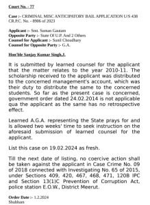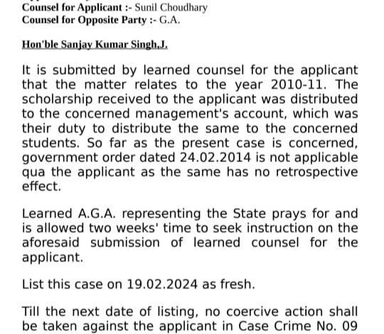 छात्रवृत्ति घोटाले की जांच आर्थिक अपराध अनुसंधान संगठन मेरठ के द्वारा जांच की जा रही है याची की ओर से दाखिल अग्रिम जमानत याचिका पर *याची की ओर से अधिवक्ता सुनील चौधरी ने माननीय न्यायमूर्ति संजय कुमार सिंह के समक्ष बहस में बताया* कि याची वर्ष 2010-11 में मेरठ जिले के 98 मदरसों में छात्रवृत्ति शासन के दिए गए निर्देश पर मदरसो के मैनेजमेंट अकाउंट में छात्रवृति के पैसे ट्रांसफर किए थे। मैनेजमेंट की ड्यूटी थी की छात्रवृत्ति बच्चों को वितरण करें ।याची के अधिवक्ता ने बताया कि 24 -2-2014 में पहली बार शासनादेश आया कि छात्रवृत्ति अब बच्चों के खातों में सीधे स्थानांतरित की जाएगी ।याची खुद वर्ष 2010 -11 में मदरसा संचालकों के ऊपर 6 एफ आई आर दर्ज कराकार गबन की गई छात्रवृति की राशि को रिकवर भी किया था। वर्ष 2012 में नियमानुसार जिले में 5 साल पूरा होने पर याची का ट्रांसफर शामली हो गया। EOW की जांच में भी सिर्फ यही आरोप है कि याची ने भारत सरकार के नियमो का पालन न कर मदरसा संचालकों के खातों में छात्रवृत्ति की रकम को स्थानांतरित किया है और याची ने बच्चों के खातों में सीधे छात्रवृत्ति का ट्रांसफर नहीं किया । याची ने नियमानुसार कार्य किया है और कोई भी घोटाला में ना तो शामिल रही है और ना ही किया है। याची को बाद में आए वर्ष 2012 के तत्कालीन जिला अल्पसंख्यक कल्याण अधिकारी एस एन पांडे ने फर्जी तरीके से याची के विरुद्ध साजिश के तहत कई एफ आई आर करा कर छात्रवृत्ति गबन किए जाने के अन्य आरोपियों के साथ याची का नाम डालकर शासन को गुमराह किया है जबकि इनके खिलाफ भरस्टाचार के आरोप में शासन व विजलेंस की जांच भी चल रही है और वर्ष 2015 तक छात्रवृत्ति मैनेजमेंट के खाते में शासन के निर्देश पर दिया जाता रहा है। हाईकोर्ट के निर्देश पर पुलिस अधीक्षक आर्थिक अपराध अनुसंधान संगठन मेरठ ने याची के विरुद्ध सभी 98 मुकदमों को एक साथ समाहित कर अन्वेषण संख्या 65 /2015 के तहत सारे मुकदमों की जांच एक साथ कर जांच जारी रखी है और याची के द्वारा दिये गए साक्षय व अभिलेखों व बयान को विवेचना में सम्मिलित नहीं किया गया है। जिस पर हाइकोर्ट ने याची के विरुद्ध कोई भी उत्पीड़नात्मक कार्यवाही पर अगली सुनवाई 19 फरवरी तक रोक लगा दिया है और अपर शासकीय अधिवक्ता को 2 सप्ताह में उपरोक्त शासनादेश के संर्दभ में जानकारी लेकर न्यायालय में अवगत कराने का निर्देश दिया है।