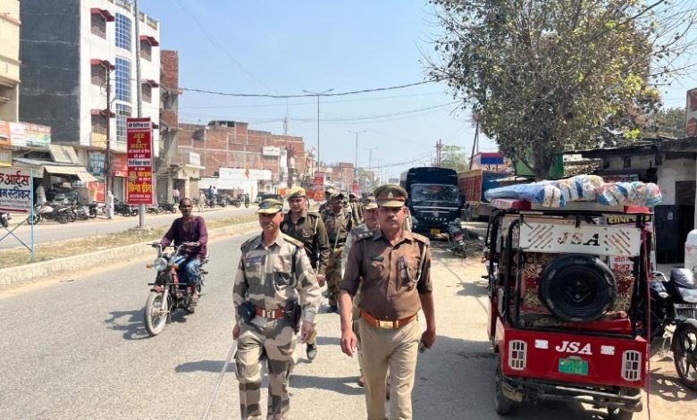 पैरामिलिट्री फोर्स फोर्स एवं स्थानीय पुलिस पैदल फीलिंग मार्च किया,