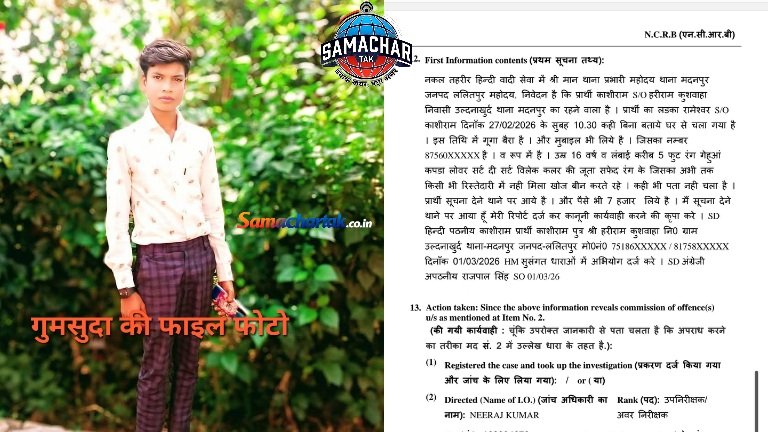 प्राप्त जानकारी के अनुसार रामेश्वर कुशवाहा पुत्र काशीराम कुशवाहा निवासी ग्राम लड़ना खुर्द थाना मदनपुर 27 फरवरी की सुबह घर से बिना बताए निकल गया था। रामेश्वर बोल और सुन नहीं सकता है। परिजनों के अनुसार जब वह घर से निकला था तब उसके पास लगभग दस हजार रुपये नकद और एक एंड्रॉयड मोबाइल फोन भी था।